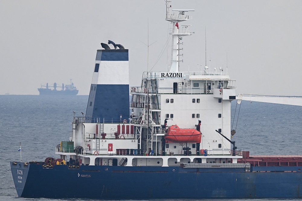 This photograph taken on August 2, 2022 shows the Sierra Leone-flagged cargo ship Razoni carrying 26,000 tonnes of corn, off shore of north-west Istanbul. - The first shipment of Ukrainian grain left the port of Odessa on August 1, 2022 under a deal aimed at relieving a global food crisis following Russia's invasion of its neighbour, the Turkish defence ministry said. "The ship Razoni has left the port of Odessa bound for Tripoli in Lebanon. It is expected in Istanbul on August 2. It will then continue its journey after it has been inspected in Istanbul," the ministry said. (Photo by OZAN KOSE / AFP)