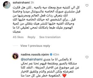 وكانت نجيم قد نشرت رسالة توعية عبر حسابها في إنستغرام للحد من نشر الأخبار الكاذبة ومحاربتها، لترد عليها إحدى المتابعات بالقول: “كل اللي كتبتيه صح ومعك مية بالمية ولكن هل فكرت قبل ما تنشري صورك الخاصة على السوشال ميديا، وخاصتا انك بتعرفي ردات فعل العالم ومجربتيها من قبل.. برأيي الشخصي إنوا حياتك الخاصة خليها إلك وحياتك الفنية خليها للنشر، هيك بتقللي من كمية الهجوم عليكي”.