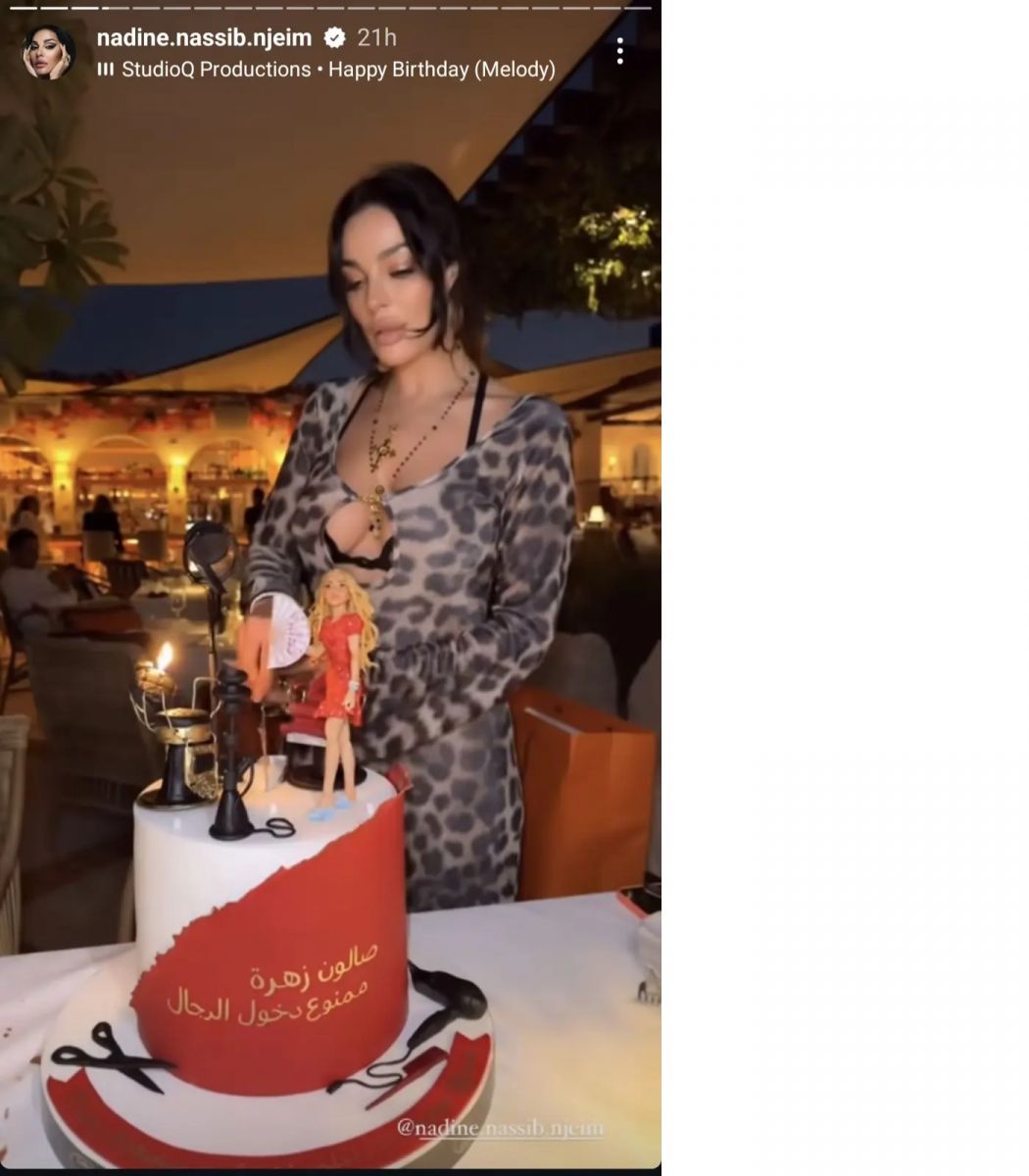 احتفلت النجمة نادين نسيب نجيم بعيد ميلادها بأسلوب مستوحى من شخصيتها في مسلسل “صالون زهرة”، حيث استعارت عبارتها الشهيرة “ممنوع دخول الرجال” ووضعتها على قالب الحلوى، في إشارة إلى أن الاحتفال كان مخصصًا لصديقاتها فقط. تصدر اسم نادين الترند بعدما شاركت متابعيها عبر خاصية القصص القصيرة على إنستغرام مقاطع فيديو من احتفالها الثاني بعيد ميلادها في دبي، حيث ظهرت وهي ترقص مع صديقاتها وسط أجواء مبهجة.