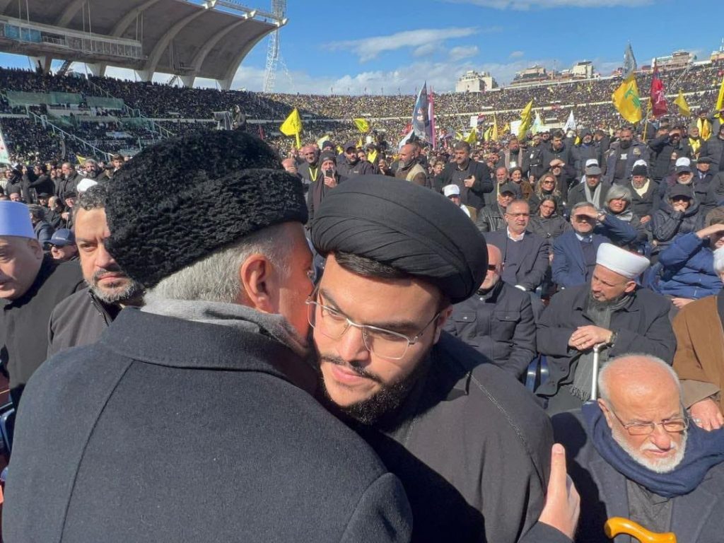 أول صورة لنجل نصرالله خلال تشييع والده.. أرسلان يعزيه بين الحشود