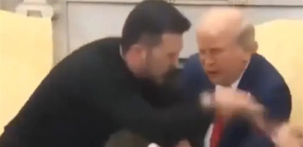 وظهر في الفيديو الذي بدا أنه مركب، الرئيس الأوكراني فولوديمير زيلينسكي يقوم من مقعده ويمسك بيد الرئيس الأميركي ترامب بانفعال، الأمر الذي تطور لعراك بالأيدي بين الرئيسين بحسب الفيديو.
