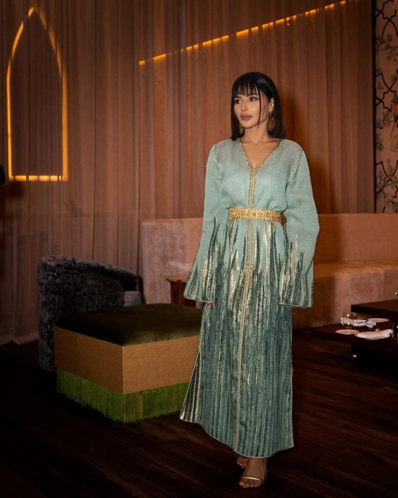 اختارت مهيرة أن ترتدي قفطانا تركواز أنيق مزينا بتفاصيل ذهبية لامع مما أضفى لمسة من الفخامة والتميز على إطلالتها ولإبراز قوامها نسقت مع القفطان حزاما ذهبيا حول خصرها، مما منحها مظهرا أكثر تألقا وجاذبية، وأكملت الإطلالة بحذاء ذهبي بكعب عال والذي أضاف لمسة من الرقي والأنوثة إلى مظهرها.