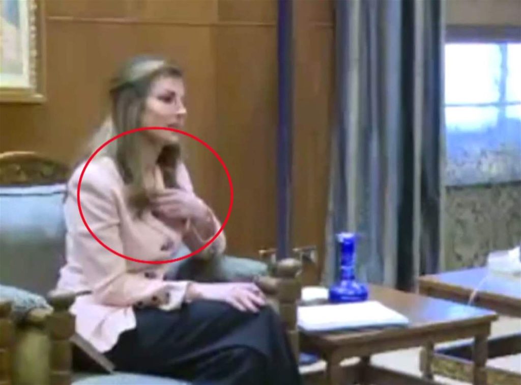 هذه المرة، اختارت أورتاغوس أن تبقى مرتدية القلادة الذي تحمل نفس الرمز، لكنها قررت أن تخفيه خلف بذتها الزهرية أثناء اللقاء، والصورة التي التقطت خلال الإجتماع وثقت هذا التفصيل.