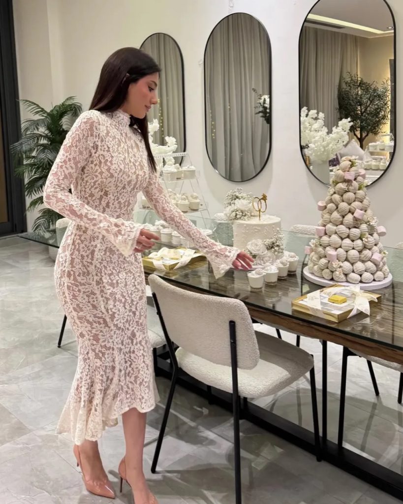 تألّقت نارين بيوتي بإطلالة أنيقة وراقية، حيث ارتدت فستاناً ضيّقاً من الدانتيل بقصّة غير متماثلة الطول بتفصيل كشكش، مع بطانة باللون الحياديّ.