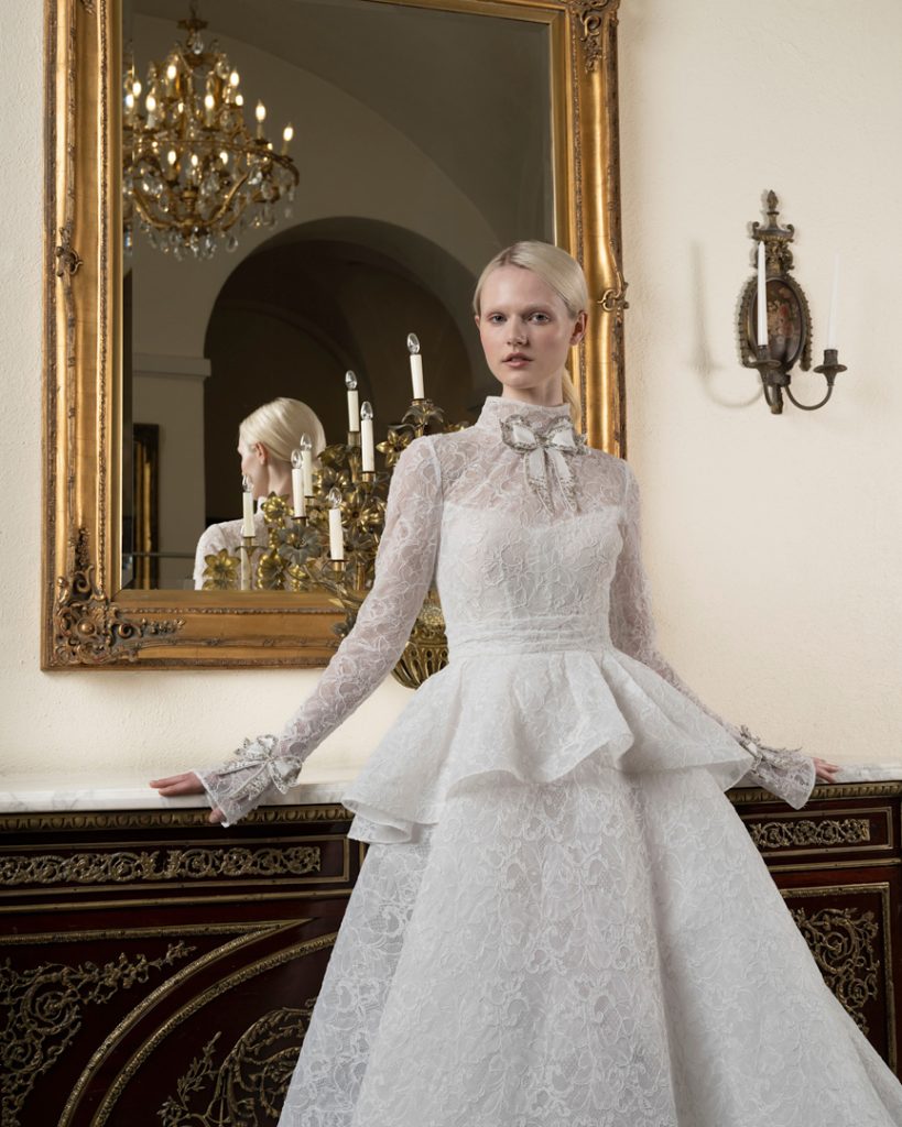 قبل انطلاق أسبوع نيويورك لفساتين الأعراس، أردنا أن نشارككِ توقعاتنا حول الصيحات التي يمكن أن نراها على منصات عروض ربيع وصيف 2026، والتي سبق وانتشرت خلال مواسم سابقة. فمن واقع ما رأينا في عروض الكوتور الأخيرة، يمكن أن نجزم بأن موضة الفيونكات ستكون الأبرز، كما نتوقع أن نرى الكثير من فساتين الزفاف ذات الياقات العالية والكابات الطويلة. أيضاً سيكون للبدلات، سواء المؤلفة من تنانير أو بناطيل، حضور كبير