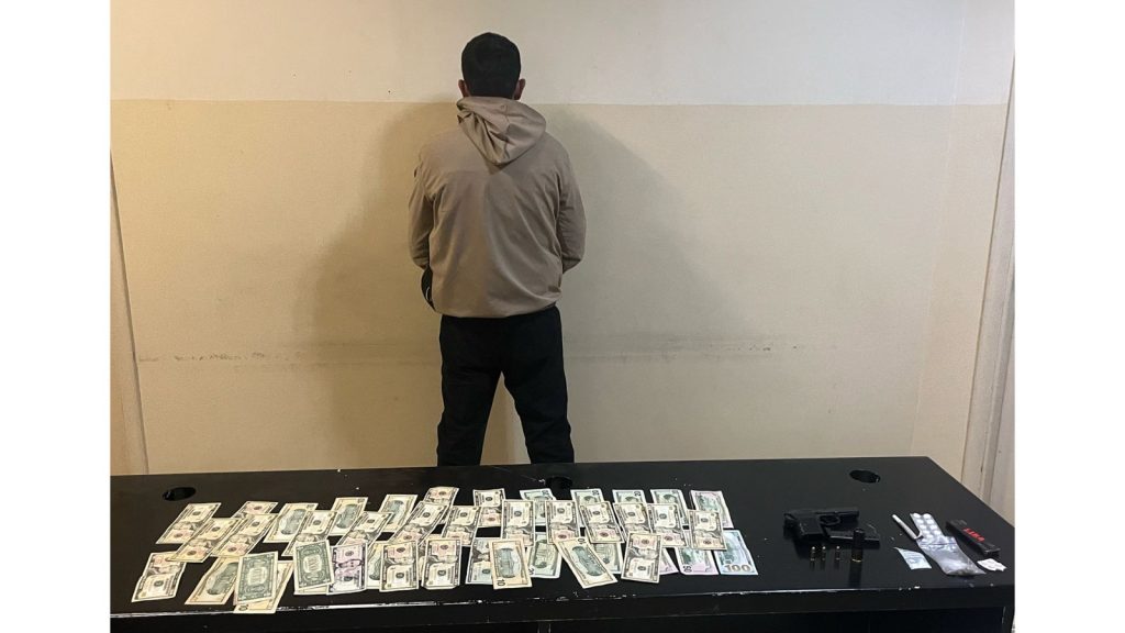 كما ضبط بحوزته سلاح حربي ومواد مخدرة ومبالغ مالية.