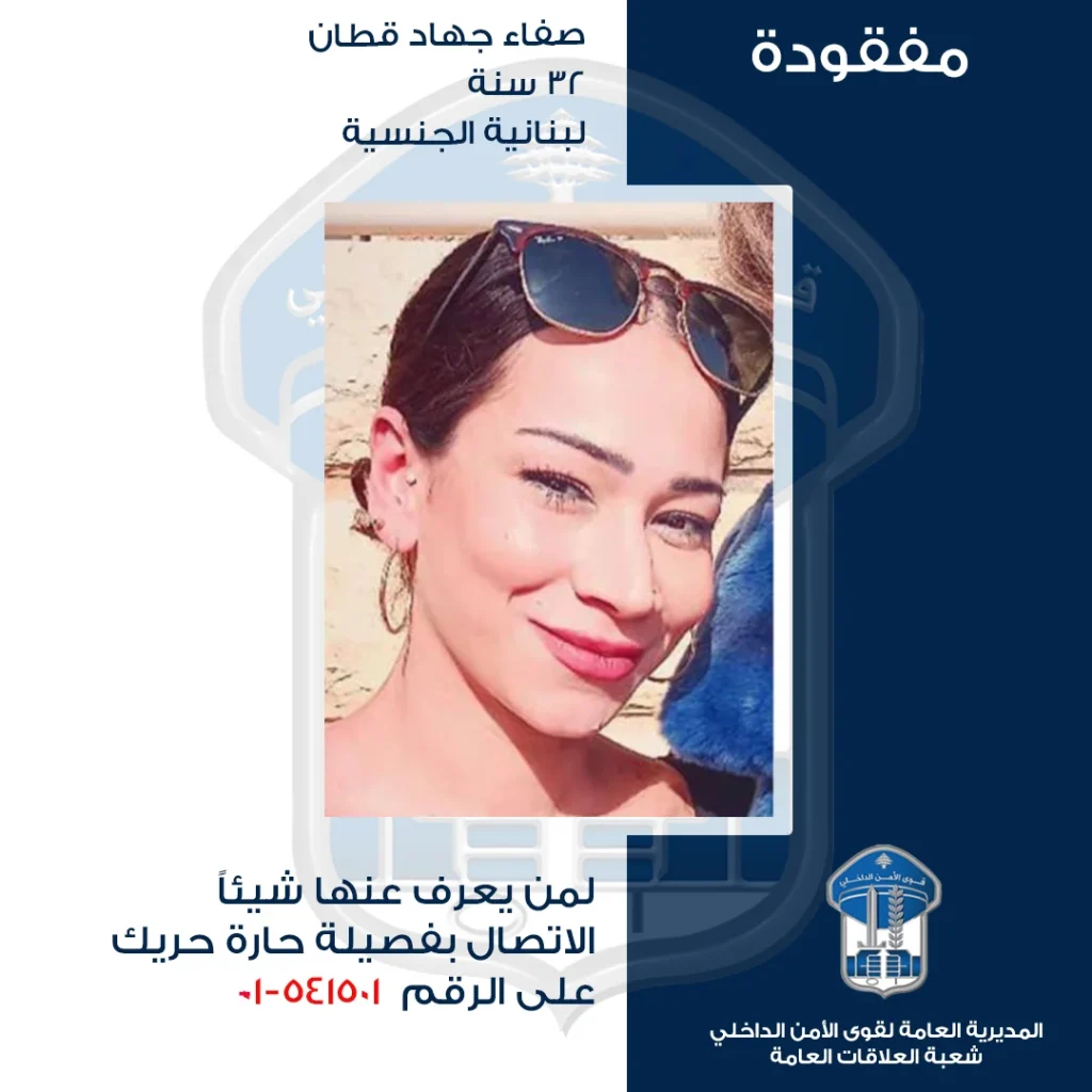 صـدر عـن المديريـّة العامّة لقوى الأمن الدّاخلي ـ شعبة العلاقـات العامّـة، اليوم الجمعة، بلاغ جاء فيه: “تُعمِّم المديريّة العامّة لقوى الأمن الدّاخلي، بناءً على إشارة القضاء المختص، صورة المفقودة: – صفاء جهاد قطّان (مواليد عام 1993، لبنانية) التي غادرت إلى جهةٍ مجهولة، بتاريخ 15-4-2025، منزل ذويها الكائن في محلّة حارة حريك – الضّاحية الجنوبيّة، ولم تَعُد لغاية تاريخه.