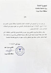 أفادت دائرة العلاقات العامة في بلدية بيروت في بيان، أن محافظ مدينة بيروت القاضي مروان عبود أصدر البلاغ الآتي :