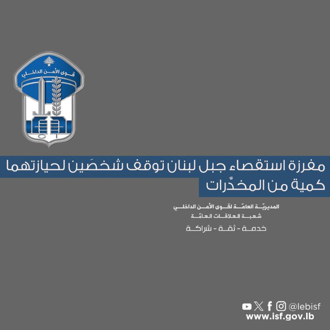 مفرزة استقصاء جبل لبنان توقف شخصَين لحيازتهما كمية من المخدِّرات