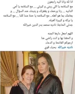 وتابعت: “وداعًا يا جزء من قلوبنا جميعًا.. وداعًا يا بركة العائلة وكبيرة العائلة، جدتي الحاجة: نادية محمد بدر الدين خير الله في ذمة الله، اللهم اجعل مثواها الجنة، وألحقنا بها وأنت راضٍ عنا.. أرجو منكم قراءة الفاتحة والدعاء”.