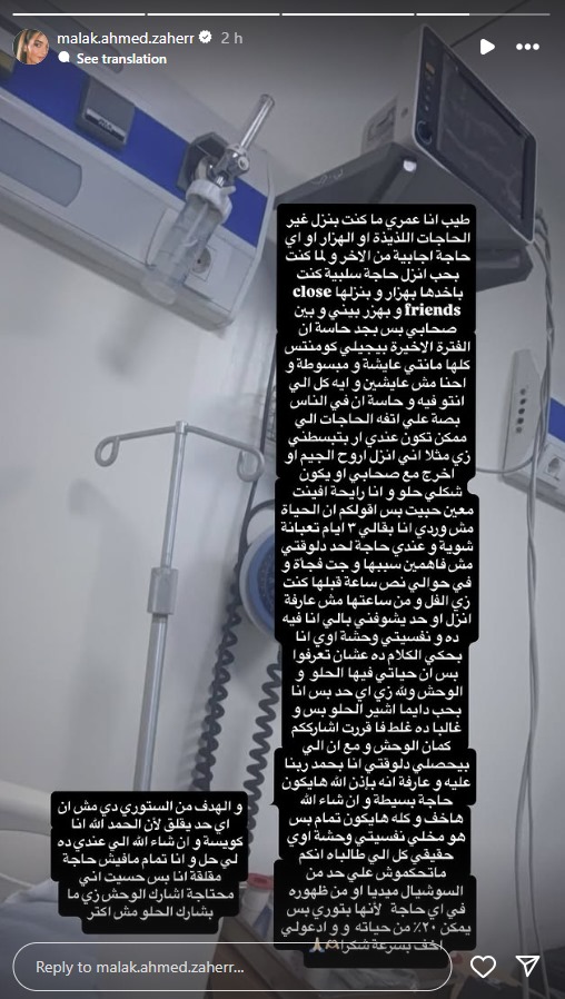 وتابعت ملك زاهر: “الفترة الأخيرة بيجي لي كومنتات كلها أنتي عايشة ومبسوطة وإحنا مش عايشين وإيه كل اللي انتي فيه ده.. حبيت أقول لهم إن الحياة مش وردي أنا بقالي 3 أيام تعبانة وعندي حاجة لحد دلوقتي مش فاهمين سببها رغم إني قبلها بنص ساعة كنت زي الفل ومن ساعتها مش عارفة أنزل أو حد يشوفني”.واختتمت زاهر حديثها: “الهدف من الاستوري دي مش إن حد يقلق، لأن الحمد لله أنا كويسة وإن شاء الله اللي عندي ده ليه حل وأنا تمام مفيش حاجة مقلقة، أنا بس حسيت إني محتاجة أشارك الوحش زي ما بشارك الحلو”.