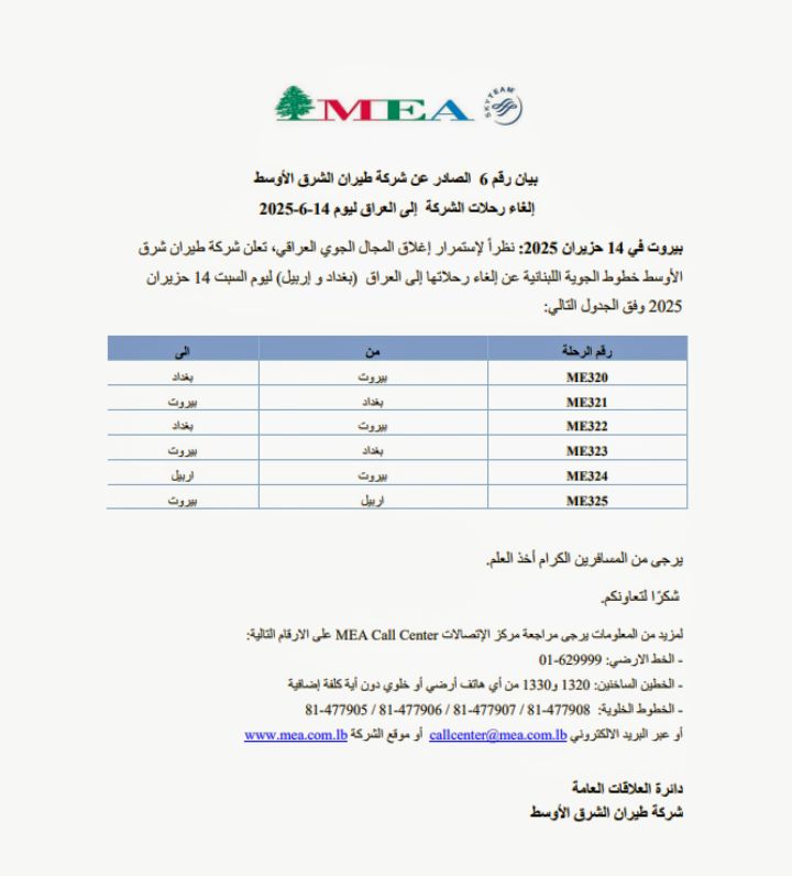 شاركها فيسبوك تويتر لينكدإن تيلقرام واتساب أعلنت شركة “طيران الشرق الأوسط” في بيان أنه “نظراً لإستمرار إغلاق المجال الجوي العراقي، نعلن عن إلغاء رحلاتنا إلى العراق (بغداد و إربيل) ليوم السبت 14 حزيران