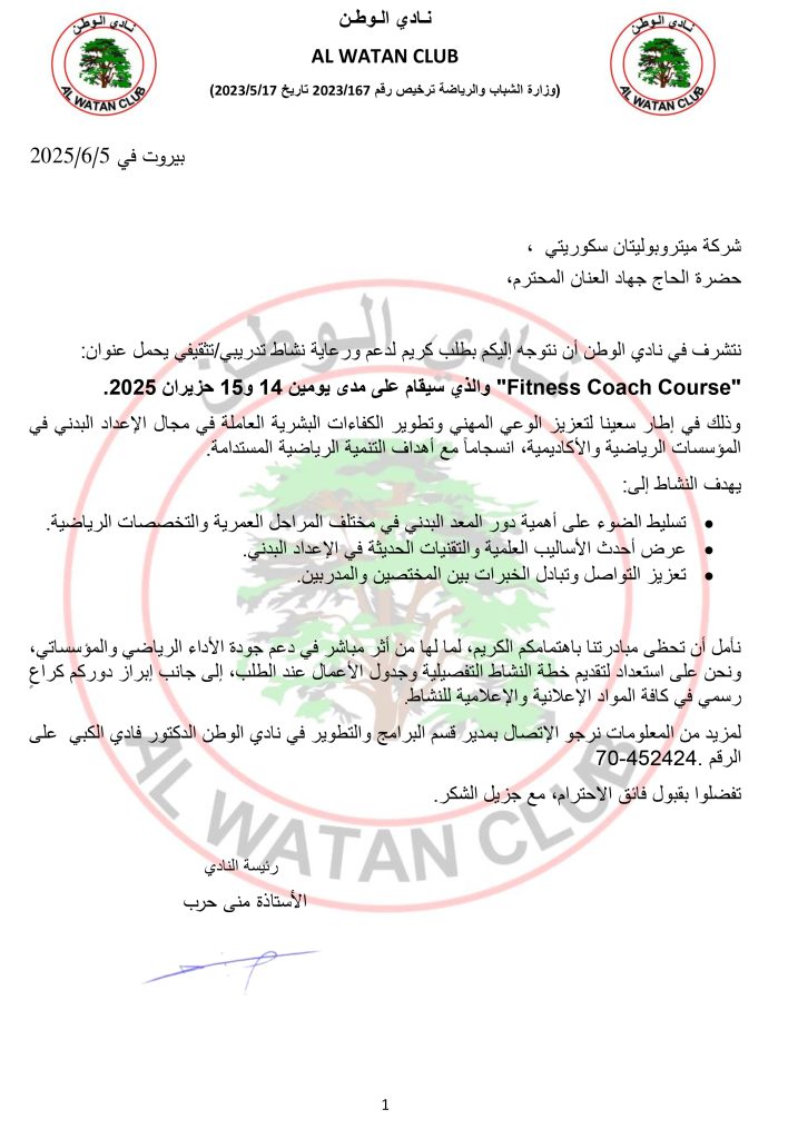 تتشرف شركة متروبوليتان سكيوريتي بالإعلان عن رعايتها لدورة “Fitness Coach Course”  التي ينظمها نادي الوطن.