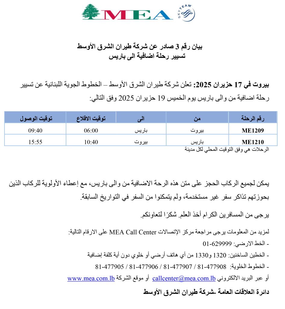 بيان رقم 3 صادر عن شركة طيران الشرق الأوسط 17 حزيران 2025 yasmin ahmad 6 أشهر ago بيان رقم 3 صادر عن شركة طيران الشرق الأوسط 17 حزيران 2025
