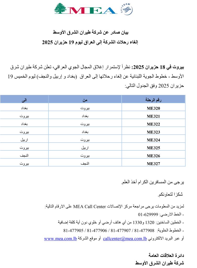 بيان صادر عن شركة طيران الشرق الأوسط 18 حزيران 2025 yasmin ahmad 6 أشهر ago بيان صادر عن شركة طيران الشرق الأوسط 18 حزيران 2025