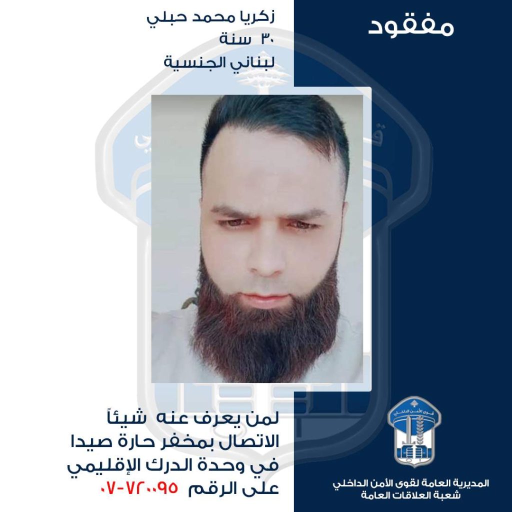 عمّمت المديرية العامة لقوى الأمن الداخلي، بناءً على إشارة القضاء المختص، صورة المفقود: زكريا محمد حبلي (مواليد عام 1995، لبناني) الذي غادر بتاريخ 19-6-2025، منزل ذويه الكائن في محلة حارة صيدا – سهل الصباغ إلى جهة مجهولة، ولم يعُد لغاية تاريخه، وهو يعاني من اضطرابات نفسية.