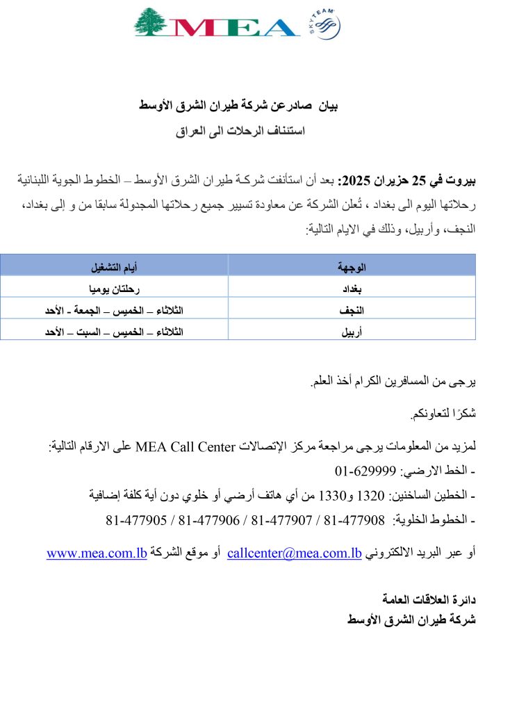 بيان صادر عن شركة طيران الشرق الاوسط 25 حزيران 2025 yasmin ahmad 5 أشهر ago بيان صادر عن شركة طيران الشرق الاوسط 25 حزيران 2025