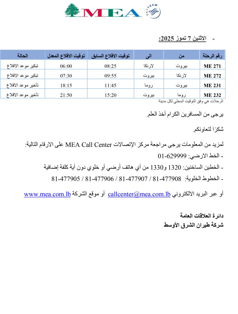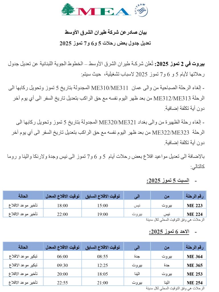 بيان صادر عن شركة طيران الشرق الاوسط 2 تموز 2025 yasmin ahmad 5 أشهر ago بيان صادر عن شركة طيران الشرق الاوسط 2 تموز 2025