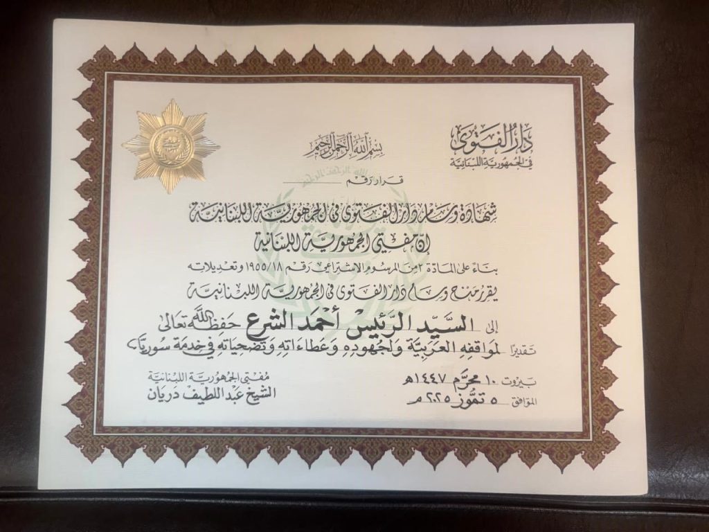 بالصورة شهادة وسام دار الفتوى الذهبي الذي قدّمه المفتي عبد اللطيف دريان للرئيس السوري أحمد الشرع rawan baltaji 5 أشهر ago
