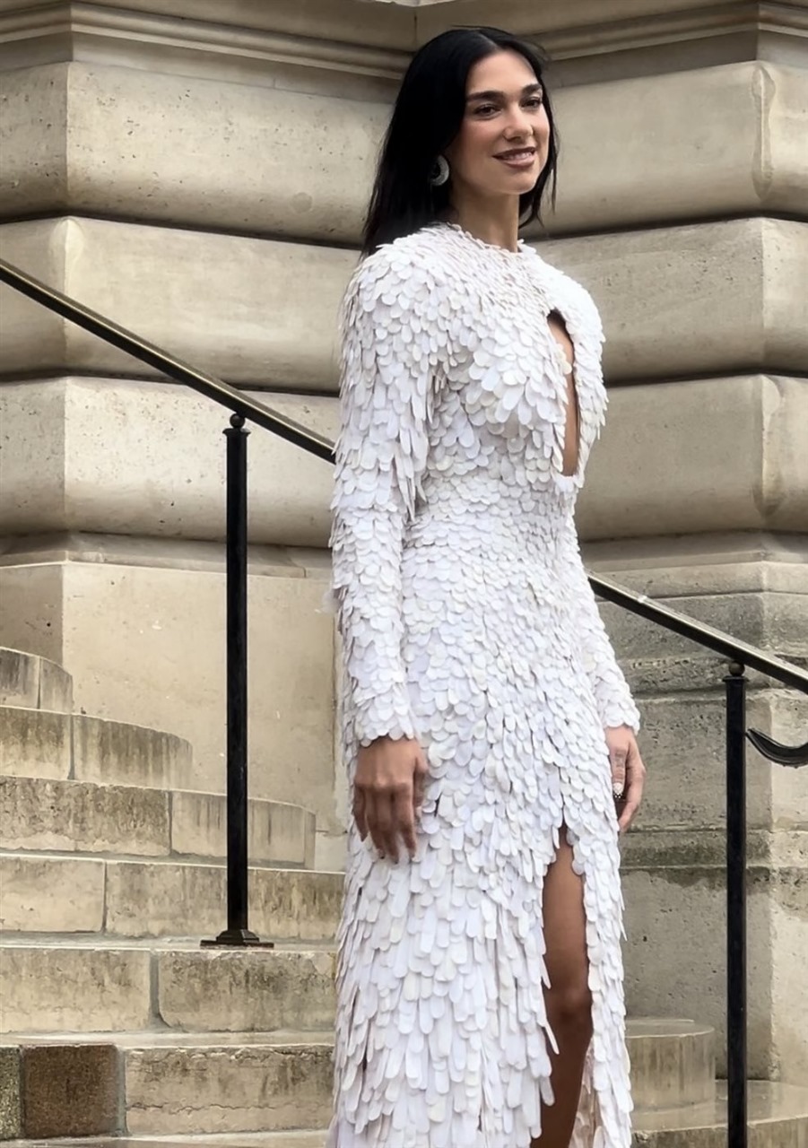 وقد اختارت دوا ليبا فستانًا أبيض طويلًا بتصميم مبهر من توقيع سكياباريلي، تميز بقصّة انسيابية وشق جانبي طويل كشف عن إحدى ساقيها، مانحًا الإطلالة لمسة درامية راقية.