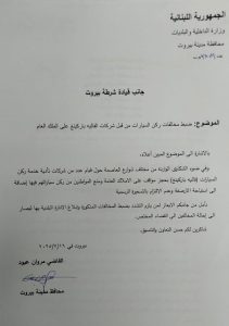 وجاء في الكتاب: “بالإشارة إلى الموضوع أعلاه، وفي ضوء الشكاوى الواردة من مختلف شوارع العاصمة، حول قيام عدد من شركات الفاليه باركينغ بحجز مواقف على الأملاك العامة، ومنع المواطنين من ركن سياراتهم فيها، إضافة إلى استباحة الأرصفة وعدم الالتزام بالتسعيرة الرسمية”.