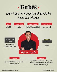 أصبح كريم عطية، الشريك المؤسس والرئيس التنفيذي للتكنولوجيا في شركة التكنولوجيا المالية Ramp، أحدث ملياردير أميركي من أصول عربية. وبثروة تقدر بـ1.3 مليار دولار، ليرفع عطية، البالغ من العمر 35 عامًا والمولود في لبنان، عدد المليارديرات الأميركيين من أصول عربية إلى 6 مليارديرات، بثروات مجمعة تبلغ 17.7 مليار دولار، وفقًا للإحصاءات اللحظية لفوربس لأغنى المليارديرات في العالم حتى 14 يوليو/تموز 2025.