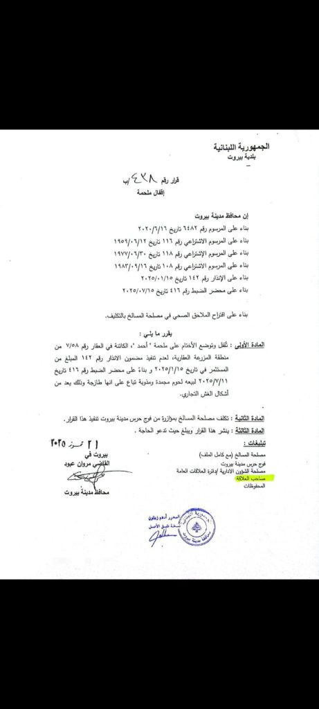 المادة الأولى: تُقفل وتُوضع الأختام على ملحمة “الريس ساهر”، الكائنة في العقار رقم 8/3711 من منطقة المصيطبة العقارية، بناء على محضر الضبط رقم 417 تاريخ 2025/07/11 لبيعه لحوم مبردة منزوعة الغلاف تبُاع على أنها طازجة وذلك يعد من أشكال الغش التجاري.
