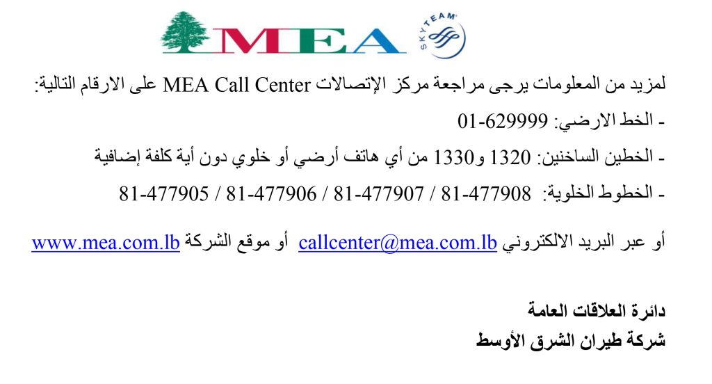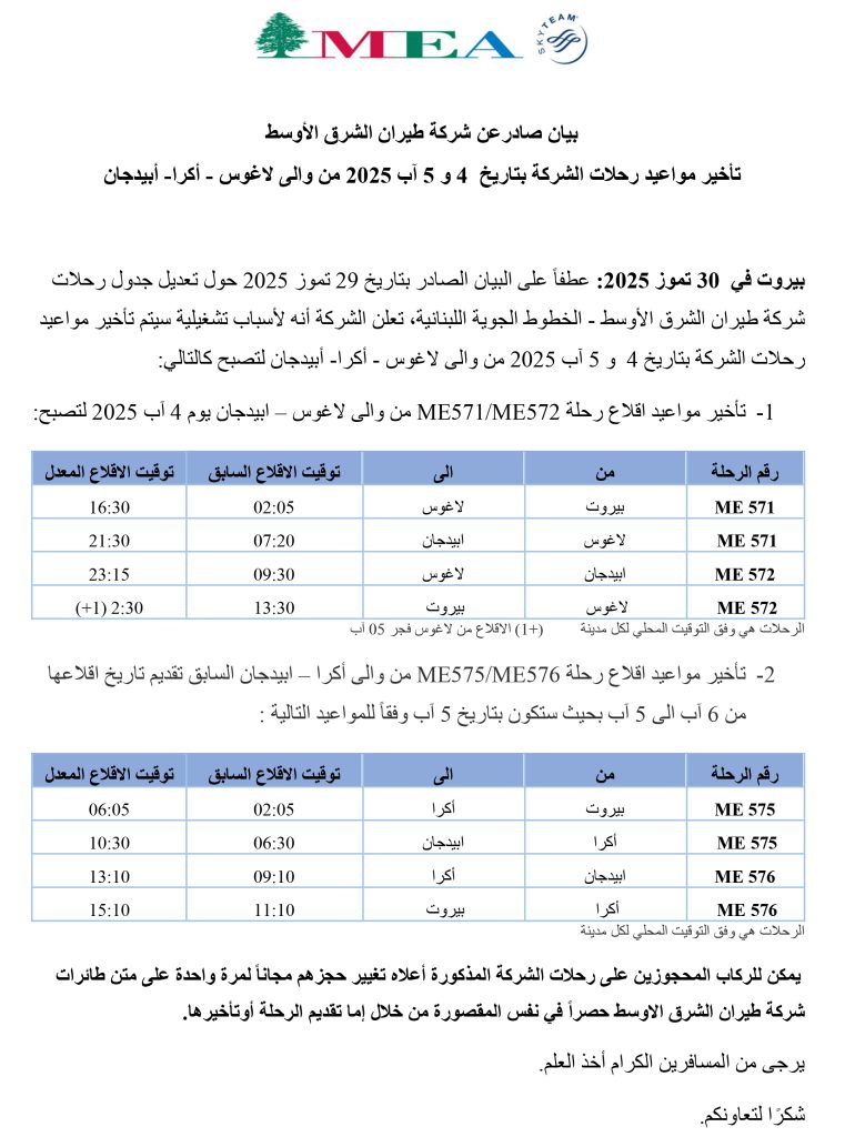 بيان صادر عن شركة طيران الشرق الاوسط 30 تموز 2025 yasmin ahmad 4 أشهر ago بيان صادر عن شركة طيران الشرق الاوسط 30 تموز 2025