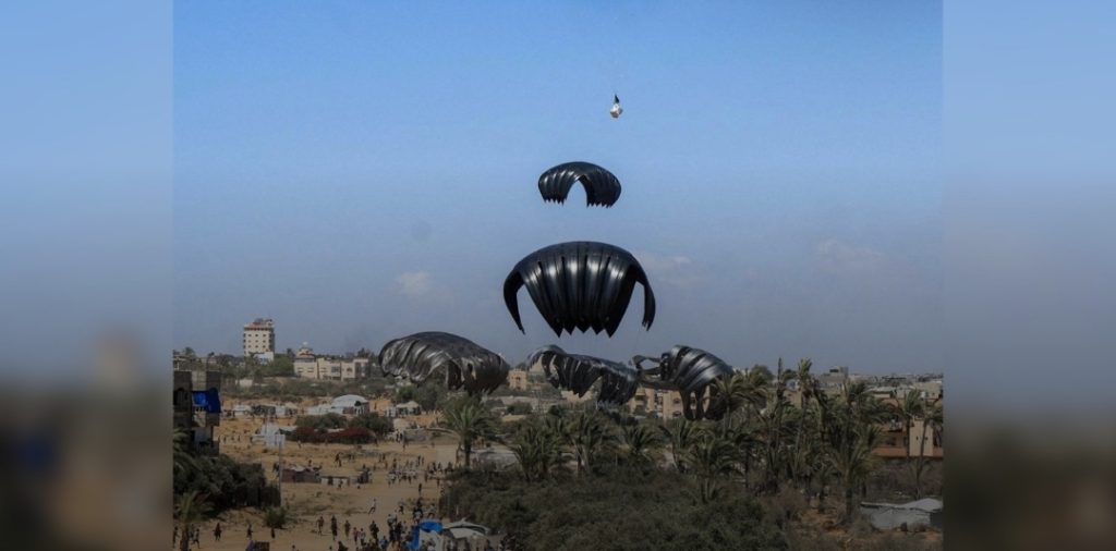 وتُشاهدون في الصّورة المرفقة المُتداولة، عمليّة إسقاط مساعدات من الجو فوق غزة وسط استمرار الأزمة الإنسانيّة