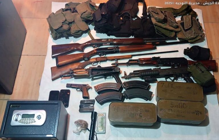 كما دهمت وحدات من الجيش تؤازر كلًّا منها دورية من مديرية المخابرات منازل مطلوبين في مناطق: جبل البداوي والنبي يوشع – المنية الضنية، مشمش – جبيل، بريتال وعرسال والتوفيقية – بعلبك، عرقة والعوينات – عكار، وأوقفت 8 مواطنين لارتكابهم عدّة جرائم منها الاتجار بالأسلحة وإطلاق النار، وضبطت في حوزتهم كمية من الأسلحة والذخائر الحربية، بالإضافة إلى أعتدة عسكرية. كما نفّذت في منطقة قب الياس – زحلة عمليات دهم لمخيمات النازحين السوريين وأوقفت 19 سوريًّا لتجوّلهم داخل الأراضي اللبنانية بطريقة غير شرعية.