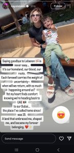 ونشرت سليمان صورة وهي برفقة إبنها، وقالت: “القول وداعاً للبنان ليس سهلاً، هذا وطننا، دماؤنا وجذورنا