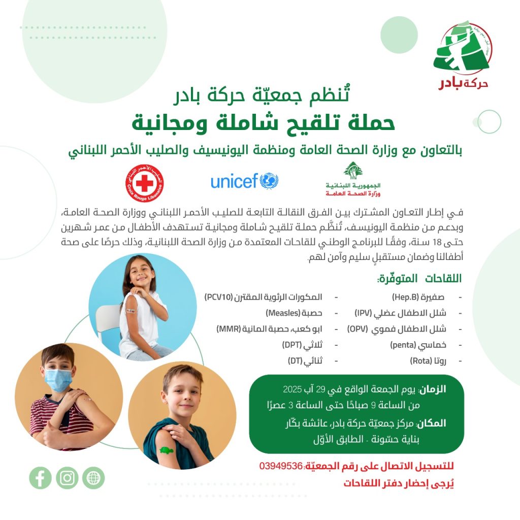 في إطار التعاون المشترك بين الفرق النقالة التابعة للصليب الأحمر اللبناني ووزارة الصحة العامة، وبدعم من منظمة اليونيسف، تُنظَّم جمعية حركة *بادر* حملة تلقيح شاملة ومجانية تستهدف الأطفال من عمر شهرين حتى 18 سنة، وفقًا للبرنامج الوطني للقاحات المعتمدة من وزارة الصحة اللبنانية، وذلك حرصًا على صحة أطفالنا وضمان مستقبلٍ سليم وآمن لهم.