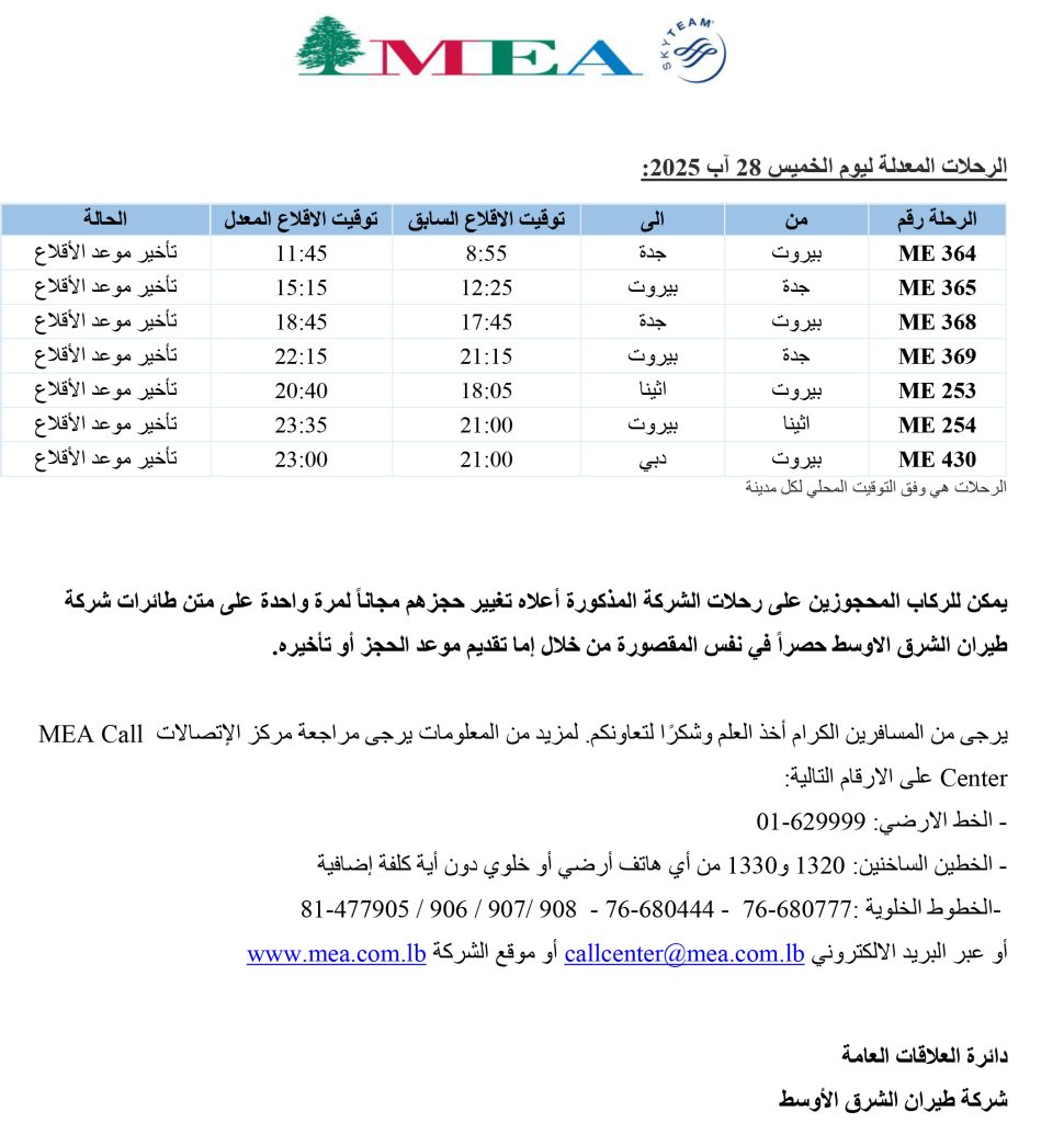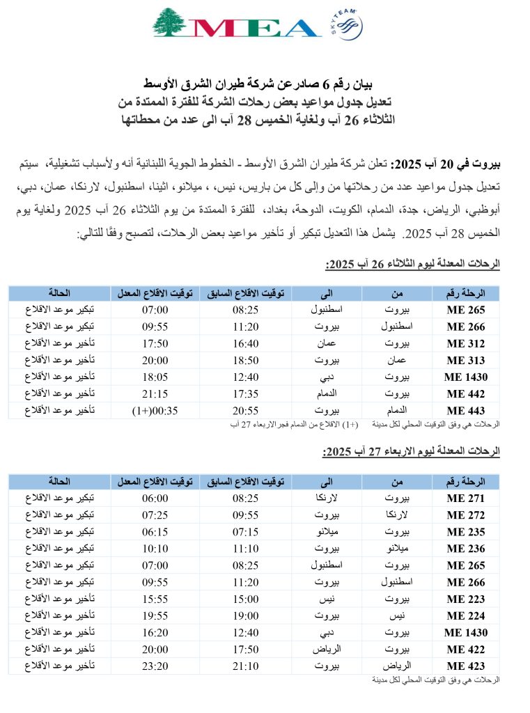 بيان 6 صادر عن طيران الشرق الأوسط 20 آب 2025