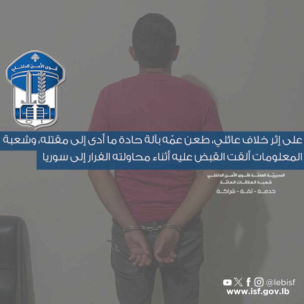 بتاريخ 10-08-2025، في بلدة الشيخ عياش – عكار، وبسبب خلافات عائلية سابقة، وقع شجار بين المدعو ط. ل. (مواليد 1987، لبناني) وابن شقيقه المدعو م. ل. (مواليد 1998، لبناني)، تطور إلى تلاسن وتدافع بينهما، حيث أقدم الأخير (م. ل.) على طعن الأول (ط. ل.) عدة طعنات بواسطة آلة حادة، مما استدعى نقله إلى المستشفى لتلقي العلاج، في حين فرّ الفاعل إلى جهة مجهولة.
