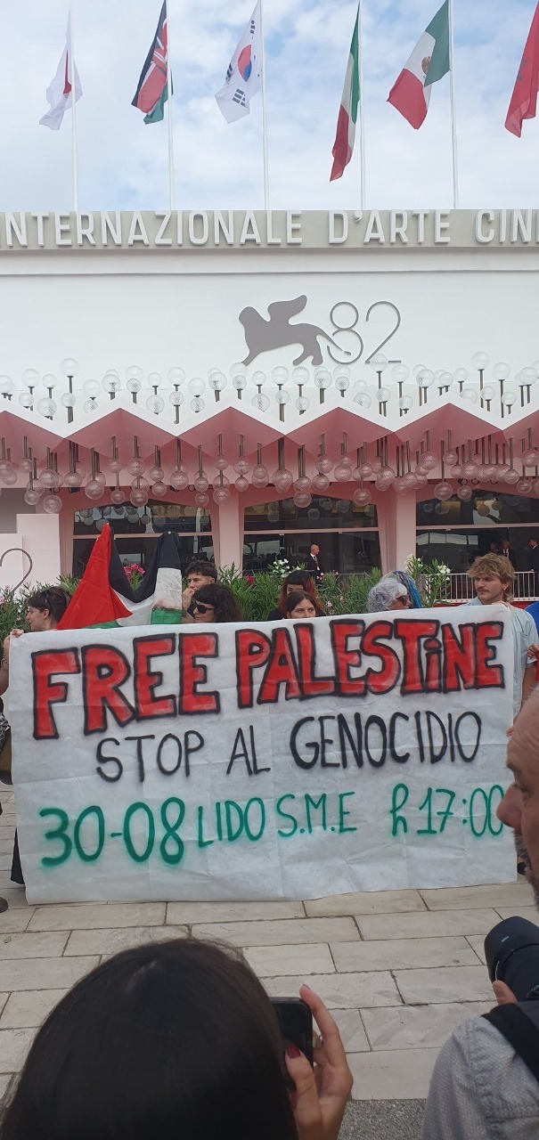 شهد مقر مهرجان البندقية السينمائي، منذ قليل، مظاهرة من أجل دعم دولة فلسطين.ورفعت مجموعة من النشطاء لافتة ضخمة أمام السجادة الحمراء لمهرجان فينيسيا، كُتب عليها “حرروا فلسطين” و”أوقفوا الإبادة الجماعية”.