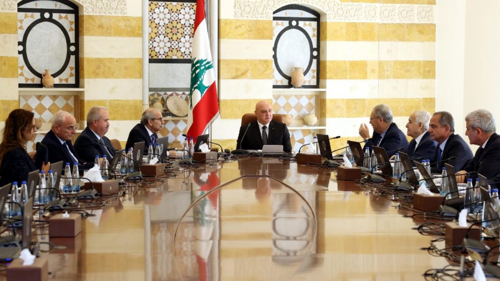 انعقدت أمس جلسة لمجلس الوزراء في القصر الجمهوري في بعبدا تناولت عرض ومناقشة الخطة التطبيقية لحصر السلاح التي كُلّف الجيش اللبناني بوضعها ووفق بيان رئاسة مجلس الوزراء رحّب المجلس بالخطة التي وضعتها قيادة الجيش والمراحل المتتالية لضمان تطبيق قرار بسط سلطة الدولة بقواها الذاتية حصراً وحصر السلاح بيد السلطات الشرعية كما وافق المجلس على مضمون البيان المرفق نصّه ربطاً والذي يُعتبر جزءاً لا يتجزأ من هذا القرار
