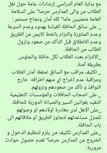 شاركها فيسبوك تويتر لينكدإن تيلقرام واتساب نشرت غرفة التحكم المروري إرشادات عامة لنقل التلاميذ من والى المدارس حرصاً على السلامة العامة. التفاصيل في الصورة المرفقة