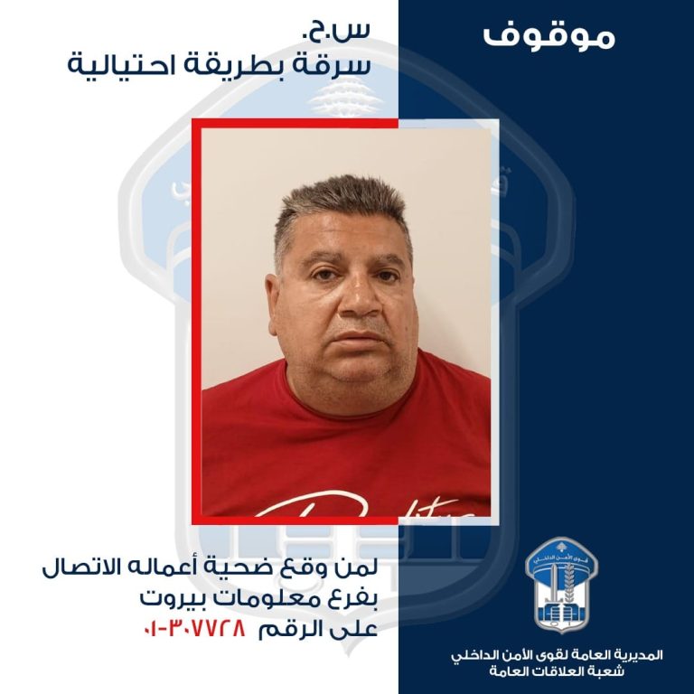 في إطار المكافحة المستمرّة لجميع أنواع الجرائم، من قبل القطعات المختصّة في قوى الأمن الدّاخلي، وملاحقة مرتكبيها على كامل الأراضي اللبنانية، ألقى فرع معلومات بيروت القبض على المدعو:
