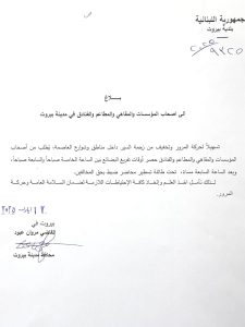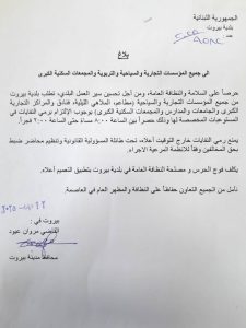 يكلف فوج الحرس ومصلحة النظافة العامة في بلدية بيروت بتطبيق التعميم اعلاه.