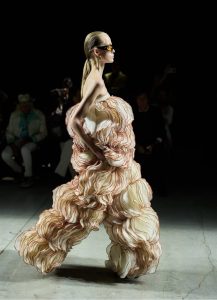 كما تنوّعت الخامات بشكل لافت، من الدانتيل النيجيري الأصيل إلى نقوش الفهد، مرورًا بالبطانيات الصوفية والدنيم، مما عكس قدرة المصمم على الدمج بين الخامات الشعبية والفاخرة. ولعل أبرز ما شد الأنظار كان فستانًا شفافًا باللون الأسود، مطرزًا بدقة ومرصعًا بلمسات حريرية حمراء، جسّد مزيجًا متوازنًا بين الغموض والأنوثة والابتكار.