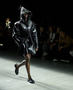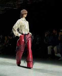 أما على صعيد الابتكار، فقد تجاوز طوكيو جيمس الشكل المرئي ليقدّم تجربة سمعية على المنصة؛ حيث جاءت بعض البنطلونات الجلدية مزوّدة بفتحات معدنية، وأخرى مزينة بخرز خشبي مكوّن لإيقاع موسيقي يُسمع مع خطوات العارضات، ما أضفى طابعًا أدائيًا غير مسبوق في عالم الموضة.