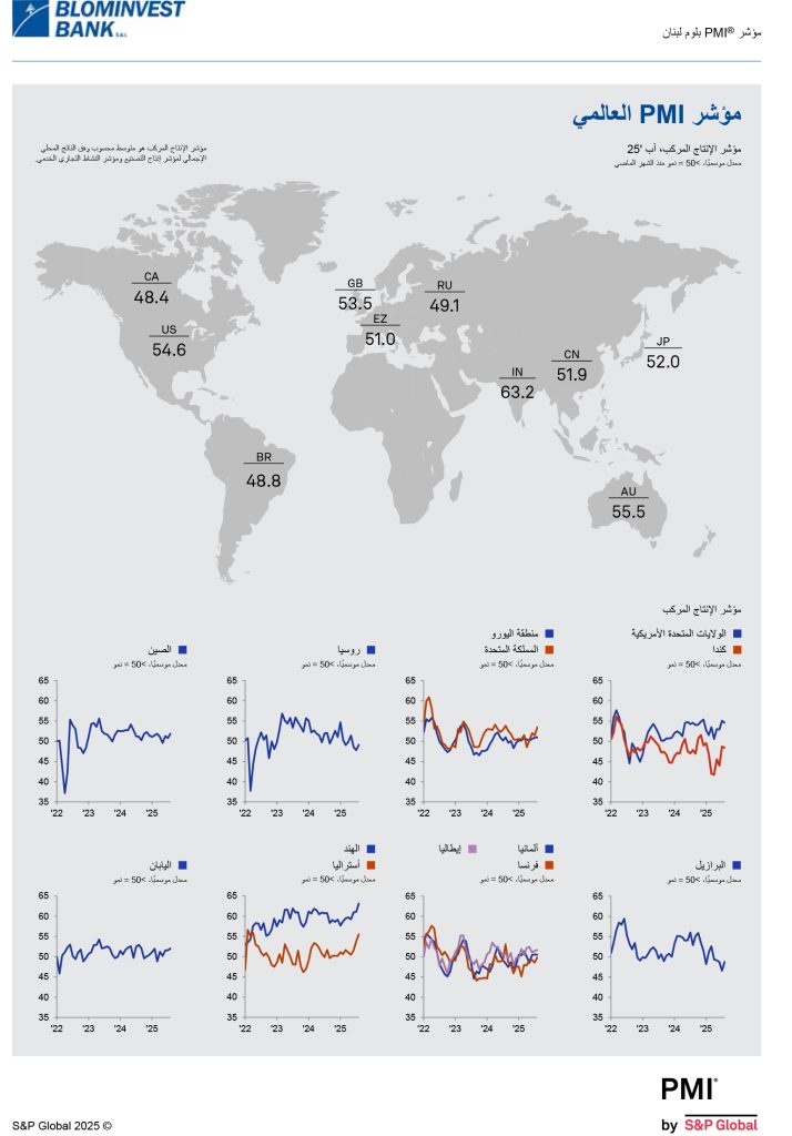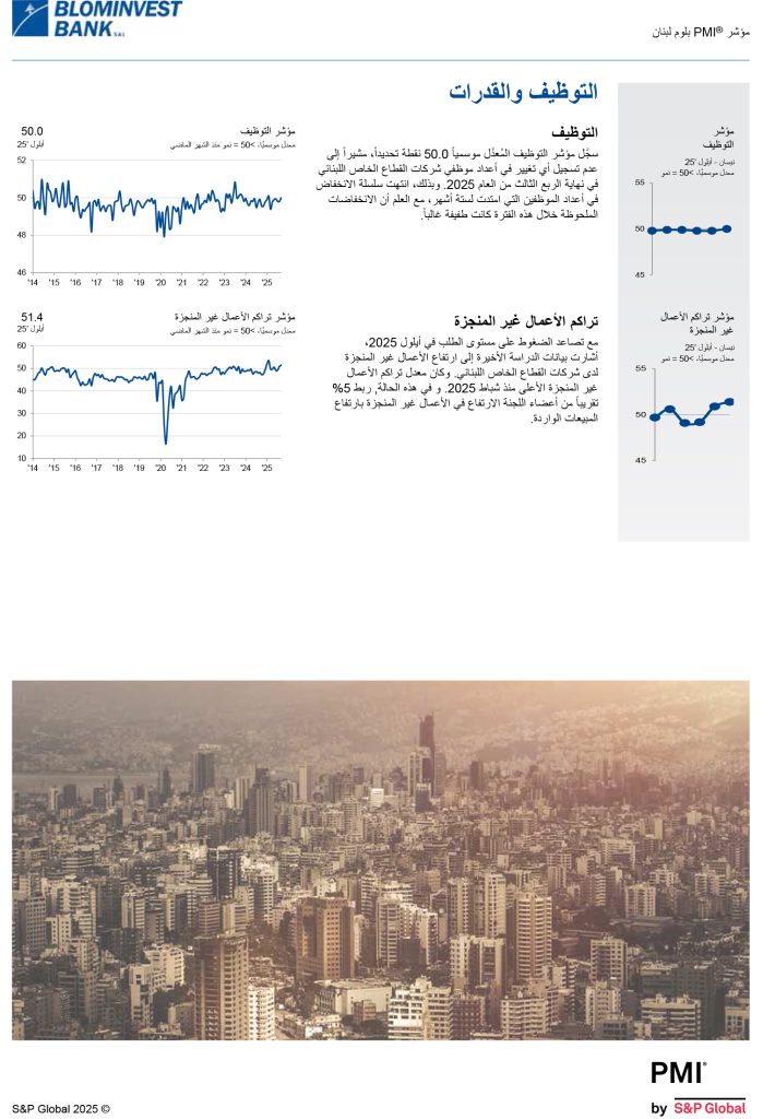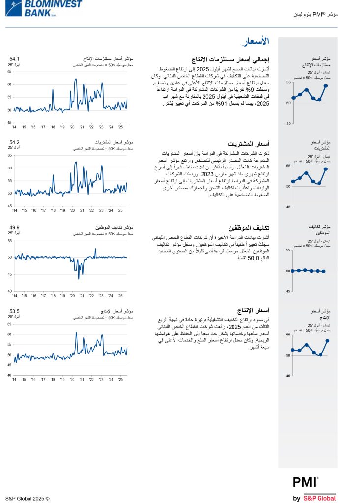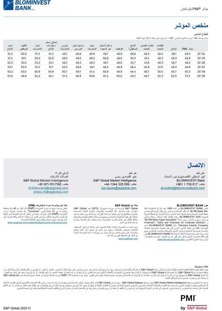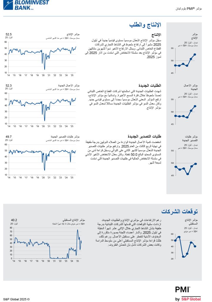 شاركها فيسبوك تويتر لينكدإن تيلقرام واتساب نتائج مؤشر مدراء المشتريات للبنان BLOM PMI لشهر أيلول 2025 ارتفع في أيلول 2025 مؤشرا الإنتاج والطلبيات الجديدة بأسرع معدل منذ تاريخ الدراسة