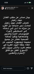 صدر عن مكتب الفنان اللبناني مهند زعيتر بيان جاء فيه: “تعرّض الفنان مهند زعيتر لحادث سير صباحًا بالقرب من منزله، ما أدى إلى إدخاله المستشفى لإجراء الفحوصات اللازمة والصور الشعاعية