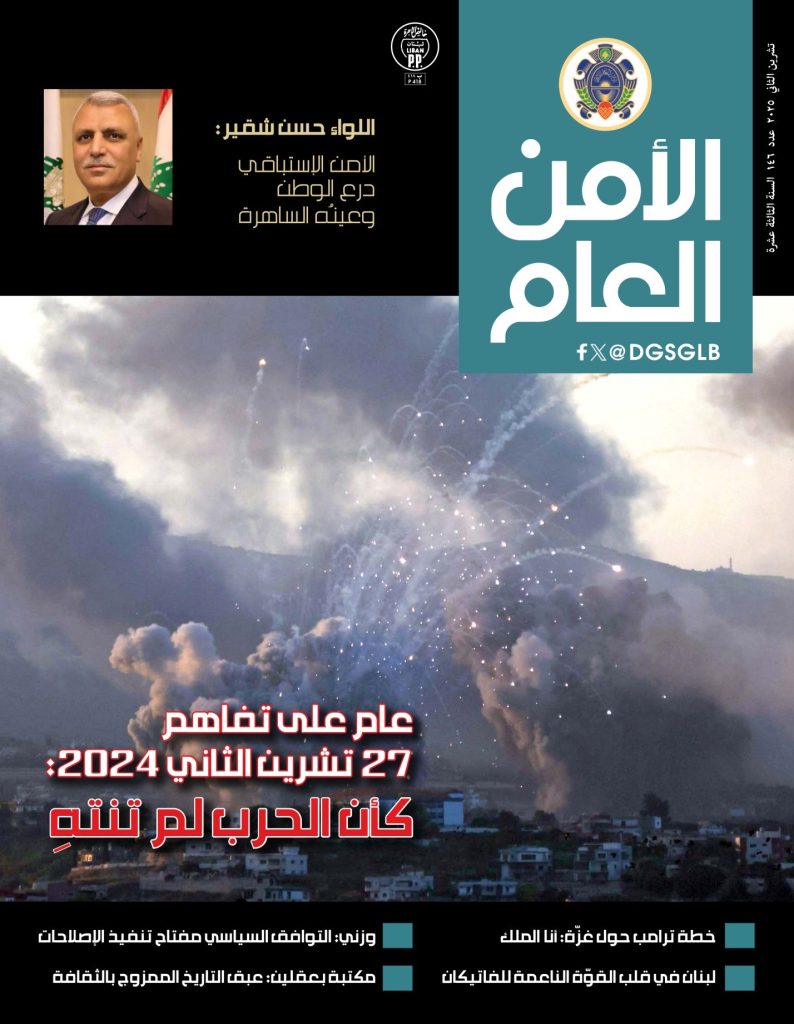 شاركها فيسبوك تويتر لينكدإن تيلقرام واتساب العدد 146/ تشرين الثاني2025 من مجلة “الامن العام” صدر العدد السادس والاربعون بعد المئة، تشرين الثاني 2025، من مجلة الامن العام عن المديرية العامة للأمن العام، وفيه: – افتتاحية العدد بقلم اللواء حسن شقير: الأمن الإستباقي: درع الوطن وعينه الساهرة. – ملف العدد: سنة على تفاهم 27 تشرين الثاني 2024، اتفاق غزة، قمة شرم الشيخ للسلام، وماذا عن الإعتراف الدولي بحل الدولتين. – تحقيق حول العلاقات بين لبنان والفاتيكان والزيارة المرتقبة للبابا لاوون الرابع عشر. – حوار مع النائبين ابراهيم منيمنة وجورج عقيص حول قانون الانتخابات، وتقريران عن الخلل في القانون بالارقام وتسلسل الحياة البرلمانية. – الاستراتيجية الدفاعية: مسار هل يستأنف مجددا؟ – الإنتهاكات والتحديات البيئية على مجرى الليطاني تهدد الثروة الوطنية. – تقارير اقليمية و دولية حول الأوضاع في سوريا وفرنسا. – كيف يرى أصحاب الإختصاص الفلتان المستشري على مواقع التواصل الإجتماعي وسبل المعالجة؟ – مدوّنة قواعد السلوك في الأمن العام: عامل التزام وبناء ثقة متبادلة. – معاملات الأمن العام التي تقدم في شركة ليبان بوست. – الوزير السابق غازي وزني: التوافق السياسي مفتاح تنفيذ الإصلاحات، وتقرير عن نتائج رؤية صندوق النقد الدولي حول الوضع في لبنان. – ماذا عن أزمة الكهرباء ورؤية المستقبل؟ – المكتبة الوطنية في بعقلين: عبق التاريخ الممذوج بالثقافة. – ماذا عن المخاطر التربوية والأخلاقية للتقنيات الذكية على المتعلمين؟ – تحقيق حول اخطار الإنهيار والإهمال التي تواجه المؤسسات التعليمية. – لاعب منتخب لبنان بكرة السلة يوسف خياط: اخترت التحدي مع الحكمة. – سيلفي سماحة صنعت في الألعاب القتالية تاريخاً من ذهب. – الى الابواب الدائمة في الثقافة والفن والرياضة، احصاءات الشهر والوثائق المزورة، والتسلية. – يمكن الاطلاع على مضمون العدد على الرابط: www.general-security.gov.lb