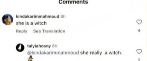 وفي منشور آخر، هاجمت ابنة كريم محمود عبد العزيز هي وابنة تامر حسني، دينا الشربيني، حيث كتبت كندة: “إنها ساحرة”، لتردّ تاليا تامر حسني معلقةً: “هي حقيقي ساحرة”.