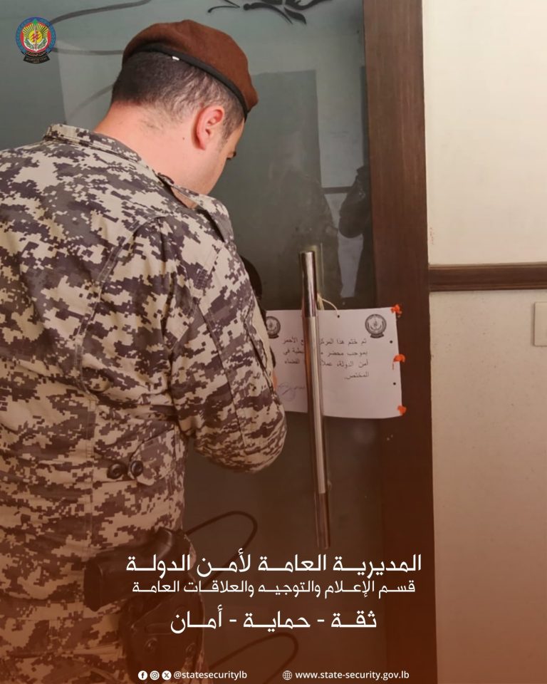 استكمالاً لجهودها في ضبط المخالفات المتعلقة بسلامة المواطنين، قامت دوريّة من مديرية الجنوب الإقليميّة – مكتب النبطية في أمن الدولة، وبالتنسيق مع مصلحة الصحّة، بختم مركزَي تجميل بالشمع الأحمر في مدينة النبطية، بعد أن تبيّن أنّهما يمارسان نشاطهما دون الحصول على التراخيص القانونية اللازمة، وذلك بناءً لإشارة القضاء المختصّ.