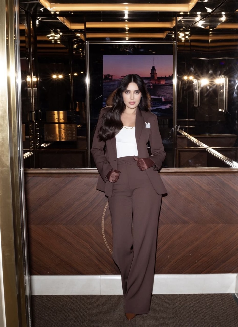 في لقطة مسائية راقية ظهرت سيرين مرتدية بدلة رسمية بلون البني الشوكولاته (Chocolate brown) البدلة مُنسّقة مع قفازات مخملية بدرجة بنية داكنة تُظهر اهتماماً بالتفاصيل وتضيف طابعاً مسائياً فاخراً. الحذاء مدبّب بكعب نحيف بنفس الدرجات البنية، ما يطيل القامة ويُكمل لغة البذلة الرسمية. تسريحة الشعر منسدلة بطريقة ناعمة ومموجة، والمكياج يبدو متناغماً مع الإطلالة وبشرة متوهجة، عيون محددة بصورة متقنة، وشفاه بلون حيادي يكمّل الطابع الراقي