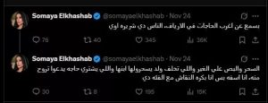 أعربت الفنانة سمية الخشاب عن استيائها من تفشي السحر والحسد بين بعض الأشخاص، عبر تغريدة نشرتها على حسابها في موقع “إكس”.