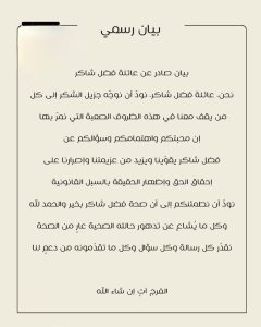 عائلة الفنان فضل شاكر أصدرت بيانًا رسميًا حسمت فيه الجدل، مؤكّدةً أنَّ صحته جيّدة وتنفي كل ما يُشاع حول تدهورها.