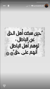 فقد نشر أبي خليل عبر خاصية “الستوري” على إنستغرام صورة كتب عليها: “حين سكت أهل الحق عن الباطل توهّم أهل الباطل أنهم على حق”، في خطوة رأى فيها المتابعون رسالة واضحة موجهة إلى حديث ماريتا عن تجربتها مع الطلاق في سن مبكرة، ولو من دون أن يذكرها بالاسم صراحة